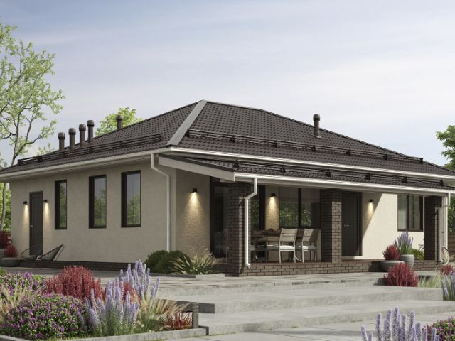 Одноэтажный дом «Даррен city» с тремя спальнями, кухней-гостиной, гардеробом, котельной и террасой. Стильный, простой, с хорошей планировкой и большими окнами. Идеален для семьи с двумя детьми — можно выделить каждому члену семьи свою комнату. Подходит для постоянного проживания.