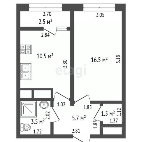 Общая площадь 37,7 квадратных метра, внутри всё грамотно организовано: просторная комната 16 метров, кухня 10.5 метров с выходом на застеклённую лоджию, раздельный санузел 3.5 метра, прихожая 5,7 метра, отдельная кладовая 1,5 метра и сама лоджия 2,6 метра. Ремонт сделан свежий и аккуратный, со вкусом.