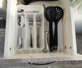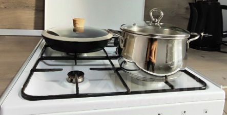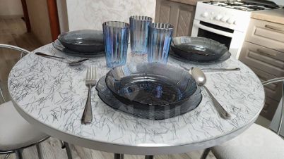 * Газовая плита, микроволновка, чайник, холодильник, посуда, столовые приборы.