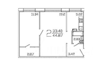 Общая площадь — 44.9 кв.м, кухня — 6 кв.м.