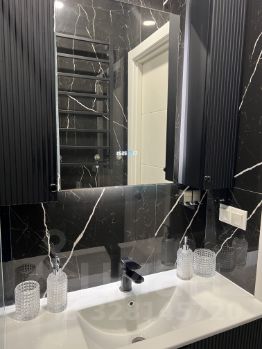 В спальне установлена большая двуспальная кровать и вместительный шкаф. Ванная комната и туалет раздельные, оформлены в стильном черном цвете с современным сантехническим оборудованием, стиральной машиной и бойлером.