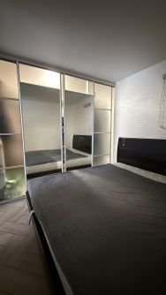 В изолированной спальне есть гардеробная, отделенная раздвижными зеркальными дверьми , что очень удобно. Кровать 200 х 200 см.