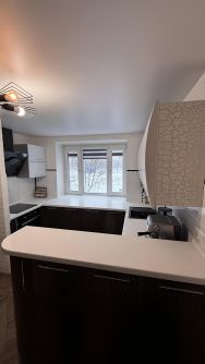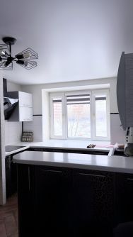 Подоконники выполнены из искусственного камня, на кухонной зоне и в спальне это является рабочей поверхностью что крайне функционально (кухня Mr. Doors).