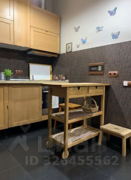 Кухня: Укомплектована бытовой техникой, гарнитуром с деревянным фасадом. Есть удобный мобильный остров-столик, который добавляет рабочей поверхности.