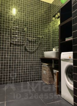 Санузел: Совмещенный, в стильной темной плитке. Установлена душевая кабина, стиральная машина и большой полотенцесушитель.